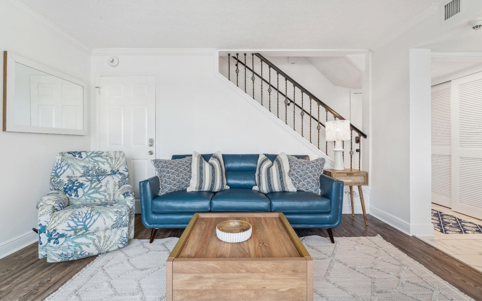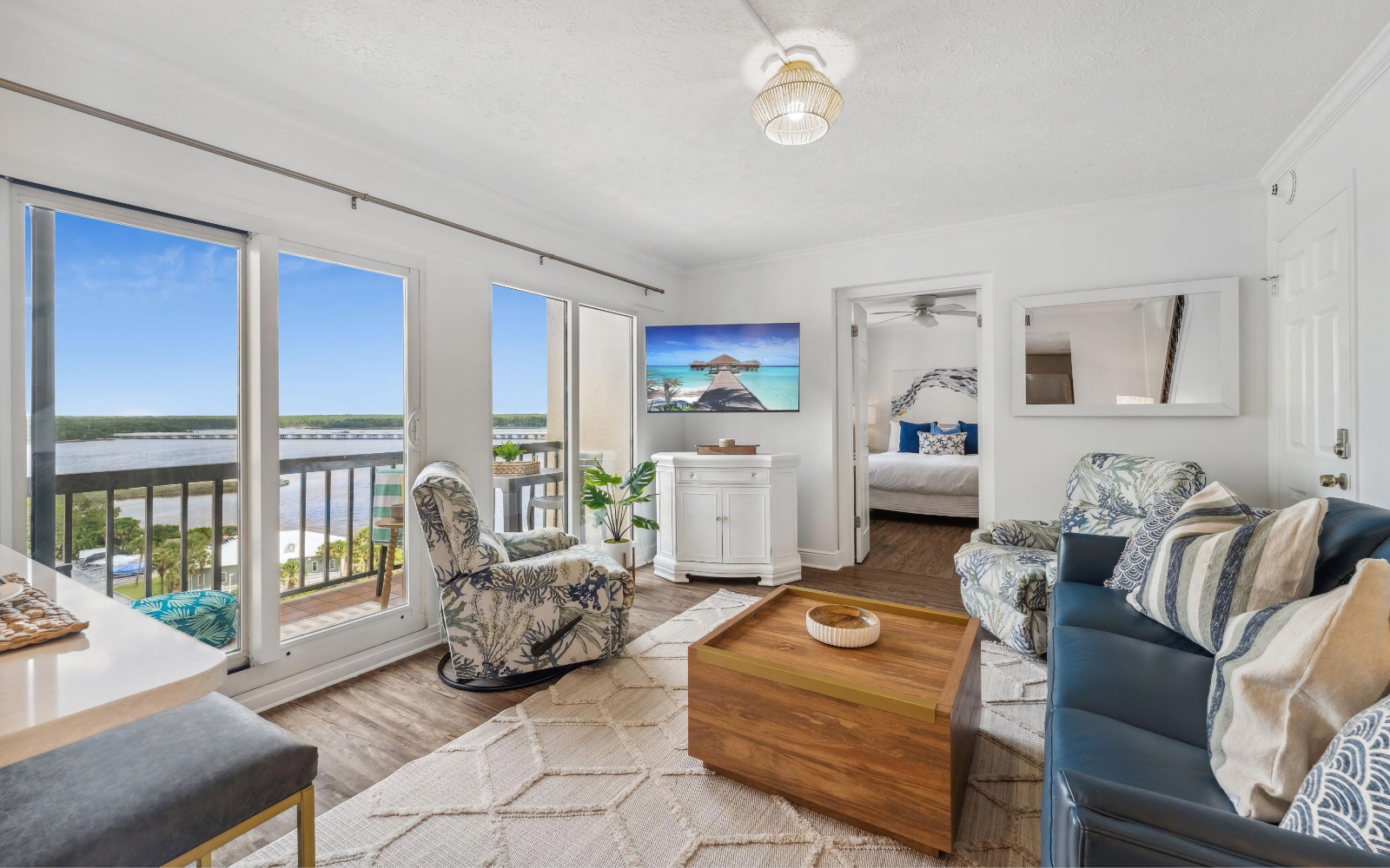 Open-concept living space with lake views, seating for 6+, and easy flow to the kitchen and dining area.